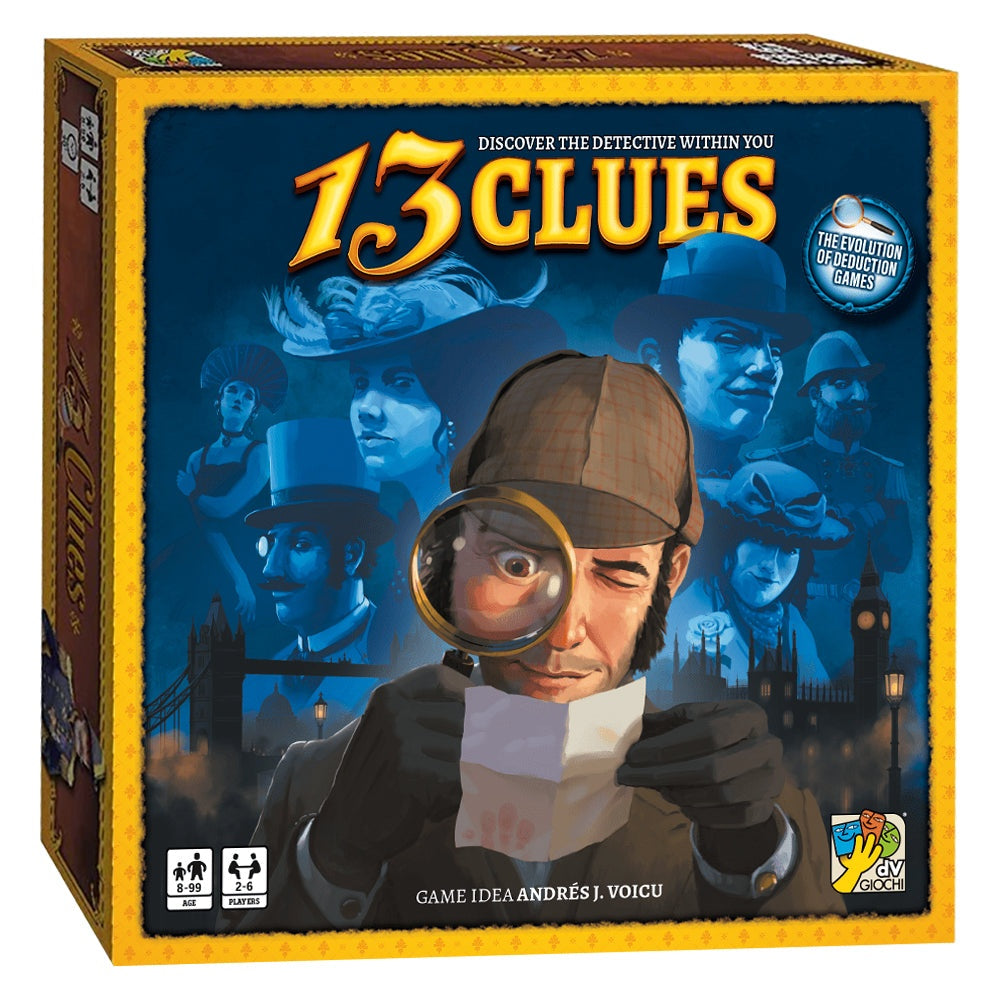The city of London has been shaken by heinous crimes, and Scotland Yard is groping in the dark. 13 Clues, set at the end of the 19th century, puts players in the shoes of the detectives, each trying to solve their own mystery. Each player sees the clues person, location, weapon for the other players but not their own. They investigate by asking questions, by consulting the secret informant, and by making accusations in order to collect clues and rule out suspects. The goal of the game is to identify which of the 13 clues match their case before the others do!