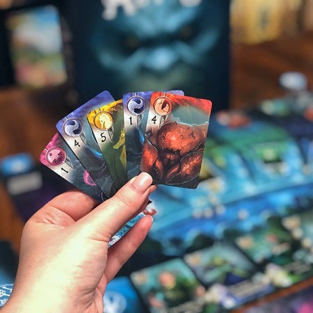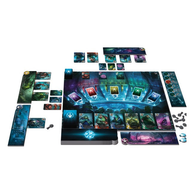 Abyss is a game of development, combination, and collection, in which players try to take control of strategic locations in an underwater city. To achieve this, players must develop on three levels: first by collecting allies, then using them to recruit Lords of the Abyss, who will then grant access to different parts of the city. Players acquire cards through a draft of sorts, and the Lords of the Abyss acquired on those cards grant special powers to the cardholder — but once you use the cards to acquire a location, that power is shut off, so players need to time their land grabs well in order to put themselves in the best position for when the game ends.