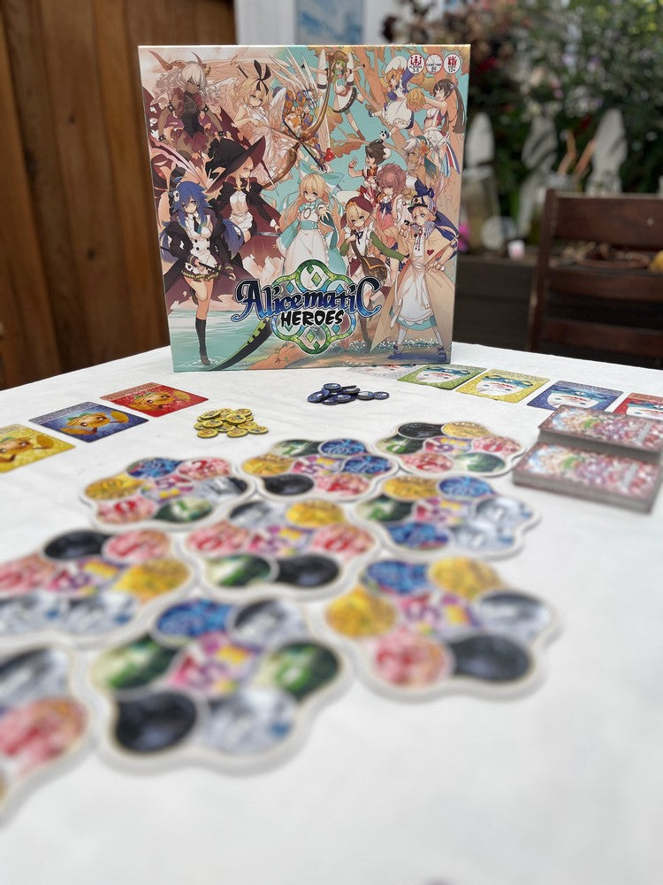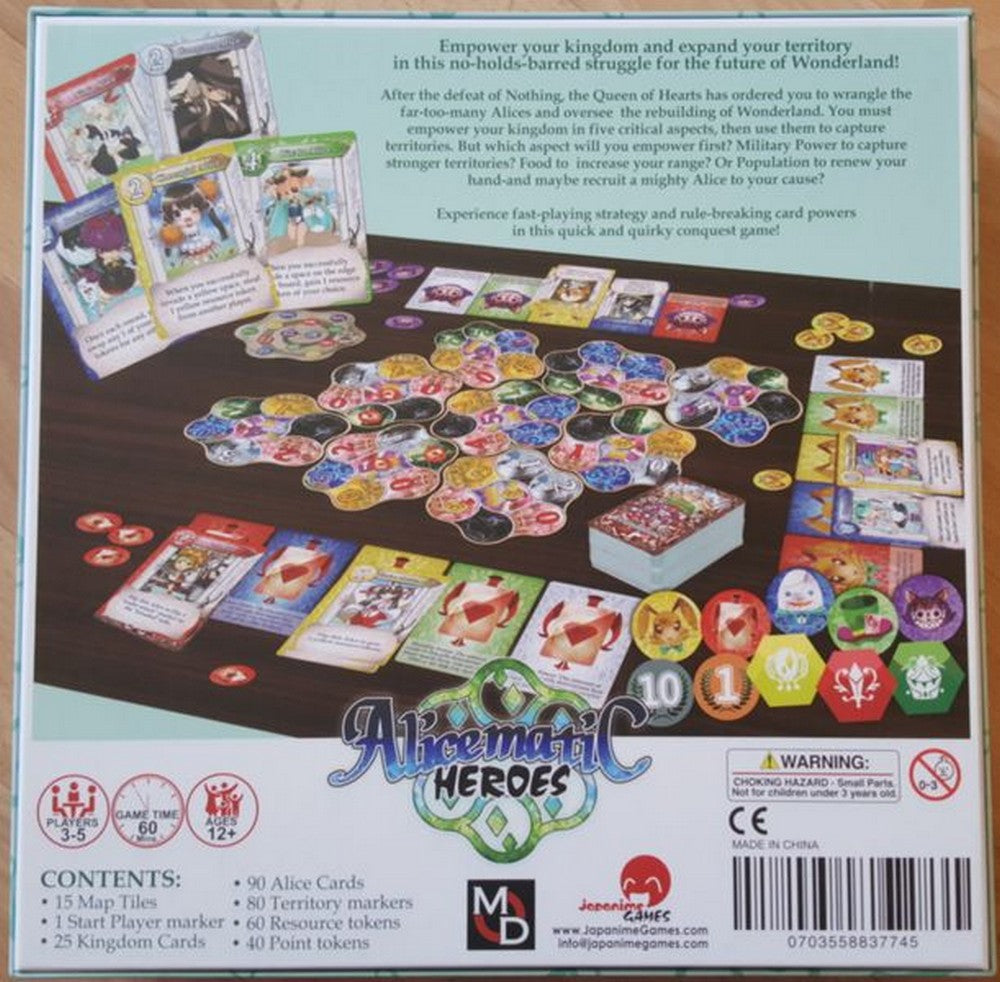 Empower your kingdom and increase your territory! Alicematic Heroes is a quick-played, yet tactical and strategic area majority board game with an engine-building mechanism! Players will spread on the board, but the vital bonus gained from invading new areas depends on how strong their kingdom is in one of the five aspects. Where will you strengthen yourself first, in your ability to play powerful cards, your power to invade strong areas, your invasion range or maybe your ability to renew your hand? A modular board and rule-breaking card effects form a highly-replayable, quick yet quirky conquest game.