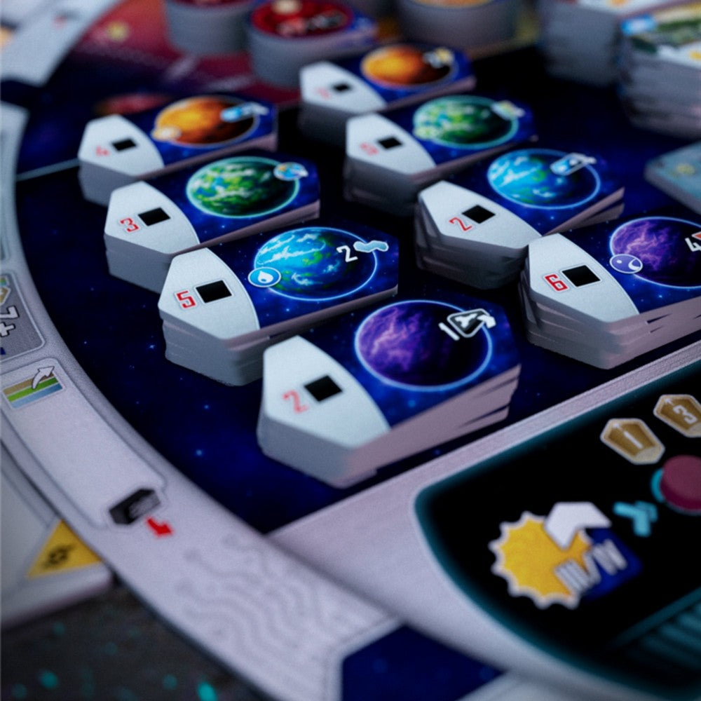 Entropy plays out over a variable number of rounds. Each turn, you must move your Scientist between 1 and 3 spaces clockwise around the Main board. You must end your movement on either an inner Action space on the Main board or an outer space of an Action tile, and resolve it. You will build Solar Systems with Stars, Planets, and Asteroids, then fill them with Life, by playing cards. You may also gain various special abilities by adding Biomes and upgrading your Console.