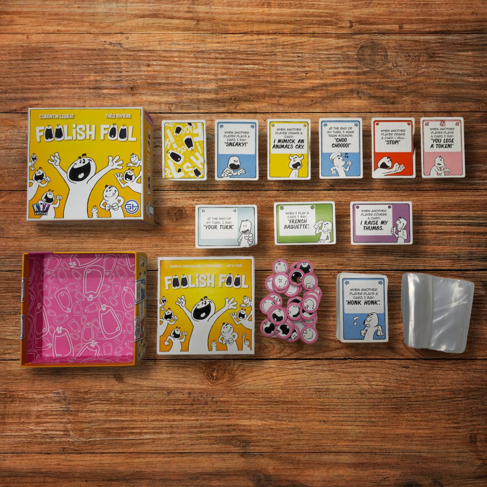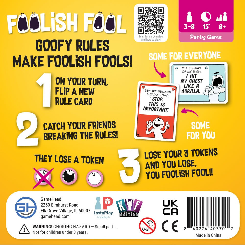Foolish Fool is a goofy party game for folks who want to have silly fun together. Each turn you read the rule on a new card. From then on, you must follow that rule, which gets harder and harder since you get a new rule each turn!