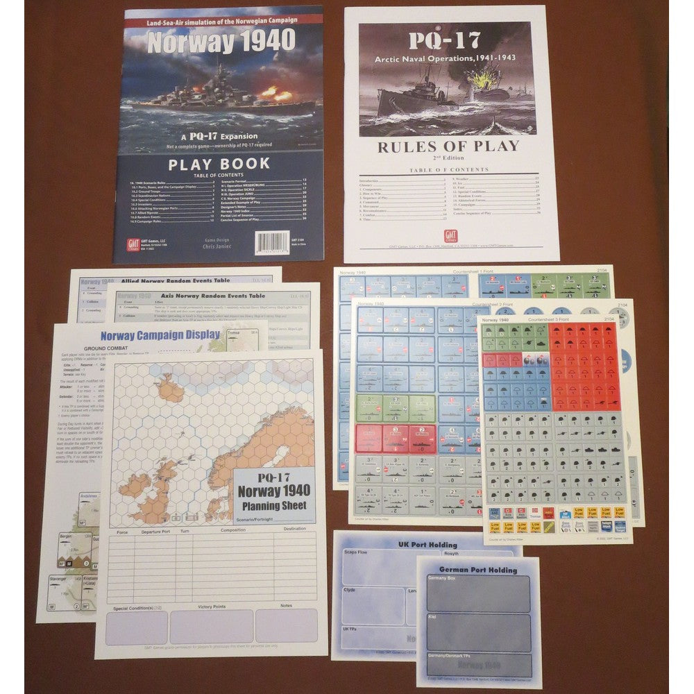 Norway 1940 is a ziplock expansion for PQ-17 that adds all the British, French, Polish, and German naval and air units needed to re-fight this tense air-naval battle, including such seldom-seen ships and aircraft as the repair ship HMS Vindictive, German Type II U-boats, Blackburn Skuas and Rocs, and early Ju88 heavy fighters. Special rules reflect the unique conditions of the campaign, such as Scandinavian neutrality, Norwegian coastal defenses, faulty German torpedoes, shore bombardments, and Allied establishment of a forward naval base (historically in the Lofotens).