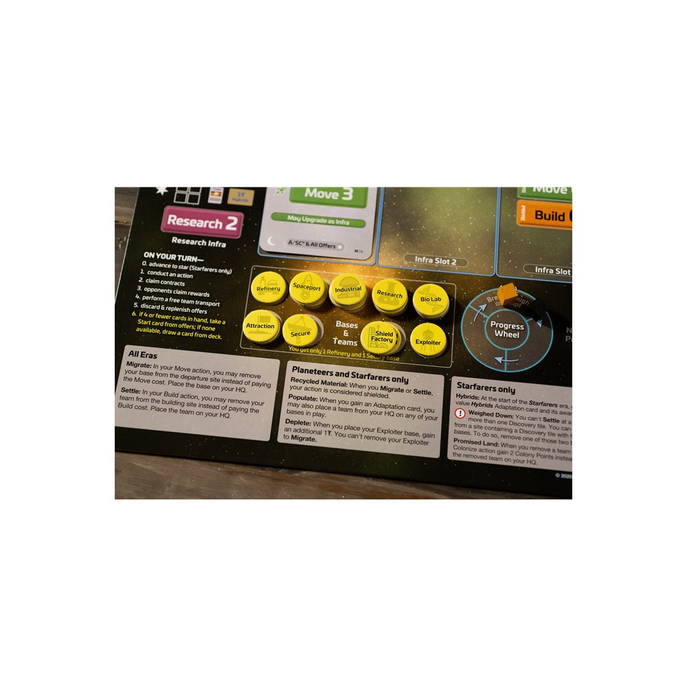 Each HQ assigns specific start cards, Infra, advantages, and limitations for all three eras. These advantages and limitations evolve in Planeteers and Starfarers, and each HQ has a special, alternate final profit option at game end.