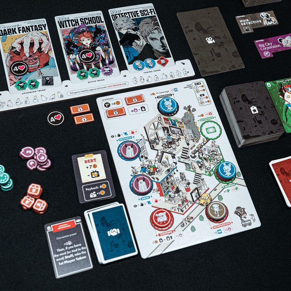 In this tycoon-style game, players use Staff members (cards placed in front of their personal Studio board) to select from a range of available actions (limited by the type of Staff). Their objective is to release an original Anime, composed of 3 Script parts (Setting, Plot, and Twist). Whenever released, players will gain resources and points according to their popularity -determined by the technical level of the Anime + how many genre matches they have to rotating Trend cards.