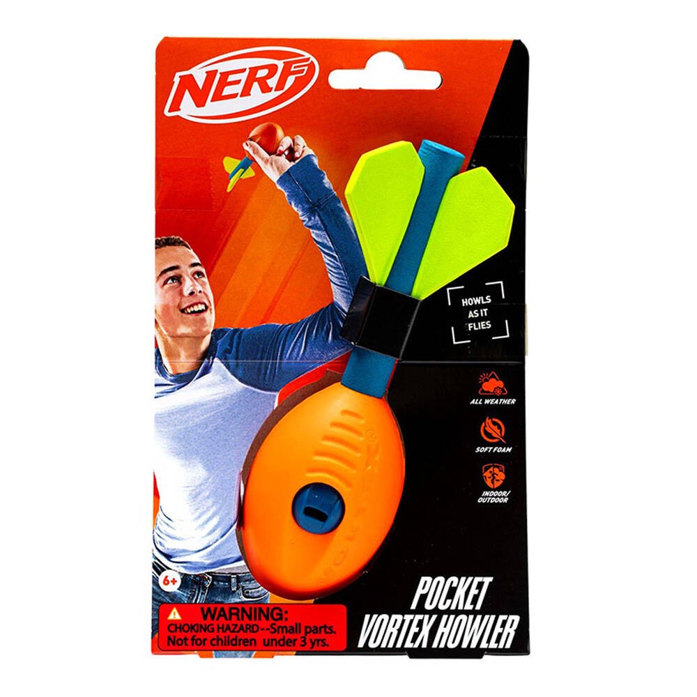 Get in the game with the Nerf Sports Pocket Vortex Aero Howler ball! It howls as it flies through the air to let everyone know the ball is on the way. The tail is designed to help the ball go far, so take aim and go long. The foam ball is sized for portability, making it easy to drop it in a backpack.
