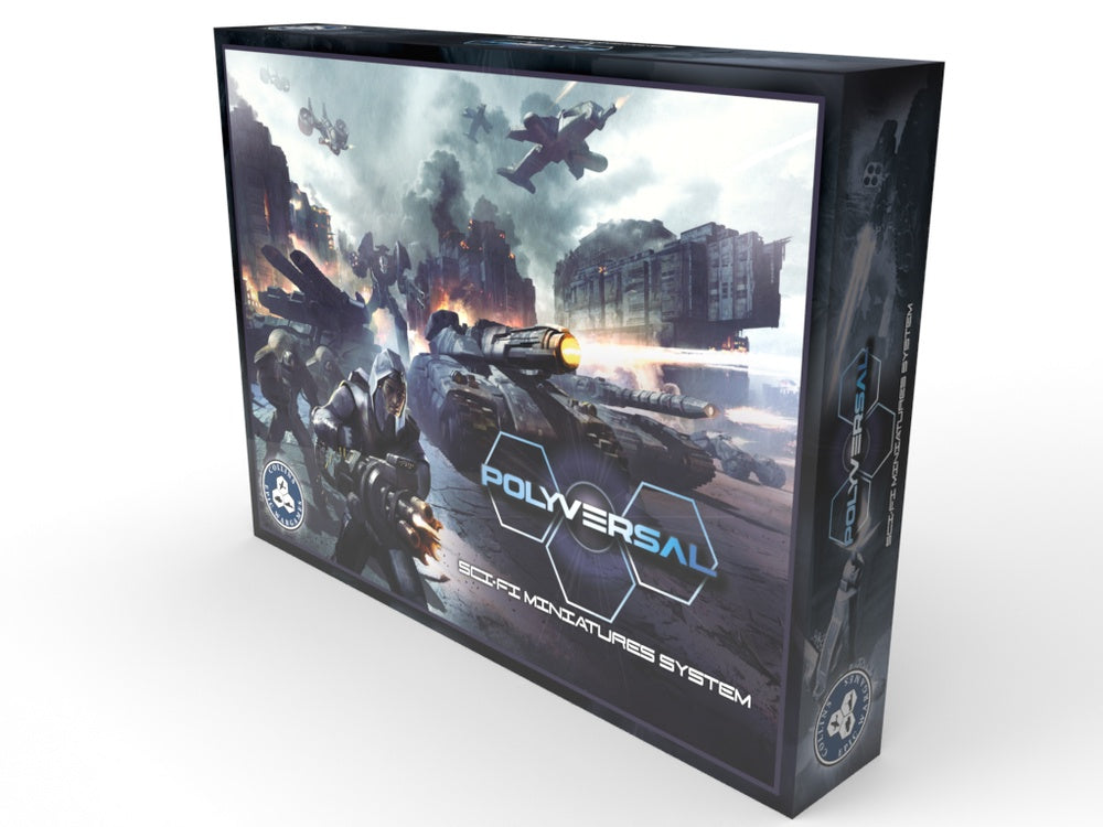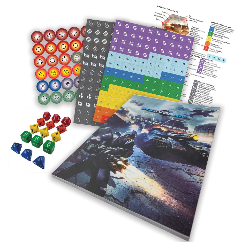 The Polyversal setting is a gritty future Earth with a storyline that promises to capture your imagination while providing endless hours of excellent sci-fi gaming. The system is flexible enough to handle many other settings as well: Wargaming as far back as WWII, Cold War or Modern settings, galaxies far away, or as far in the future as you can imagine. CEW00009 is the Polyversal base game without miniatures. The boxed set includes a 173-page full color rulebook including design system documentation, 2 Quick Reference Cards, 4 sets of Orders Tokens, 4 sets of tracking counters, 15 color-coded polyhedral dice (3x each D4-D12), and access to the Arsenal design application for unlimited customization. Use any miniatures from any line, or even your own designs, and bring them to the tabletop with Arsenal.