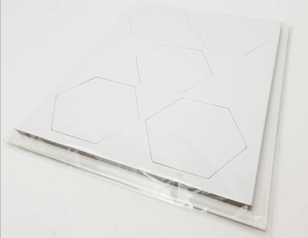 Polyversal Accessory: 25x 3” chipboard hexagonal blanks plus 10 printable sheets of 8.5”x11” thermal die-cut hexagonal peel-and-stick photo paper allows players to print out Polyversal Combatant Tiles from the Arsenal design application, then simply peel and stick the designs to the hexagonal blanks. This gives the game pieces a nice feel and requires no trimming or gluing. The output of Arsenal perfectly matches the hex paper, and prints 5 tiles per sheet. Handles making 25 Polyversal Combatant Tiles (front and back sides). Compatible with Ink Jet printers.