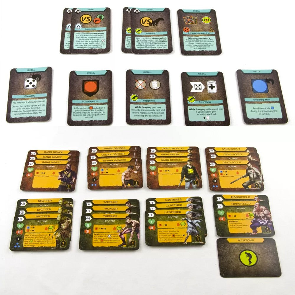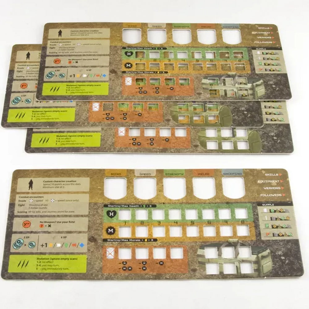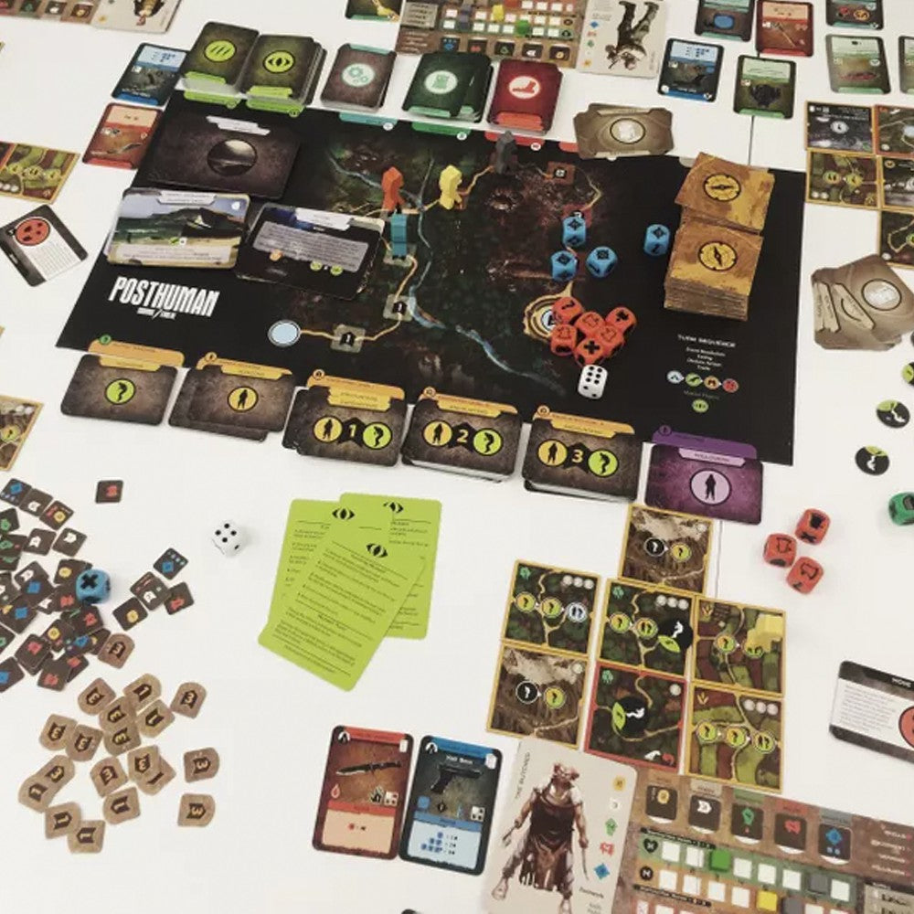 Posthuman is a board game for 1 to 4 players. The goal is to complete 10 zones on a random tile-based map. Each zone contains either combat or story-based encounters which players must survive to progress. Mutant encounters can inflict scars, bringing players closer to becoming mutants themselves and switching sides. Players can help one another to stay alive, or go alone. Mutant players work together to stop human players from reaching The Fortress.