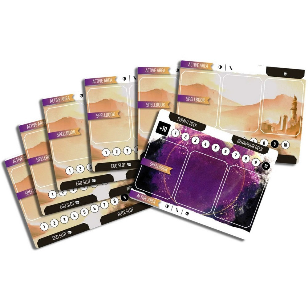 The goal of the game is to reduce the tyrants' health to zero before they escape! On your turn, you can place spell cards in your grimoire. Then, you can discard cards of the same color to charge those spells. Once a spell is charged, it must be cast.