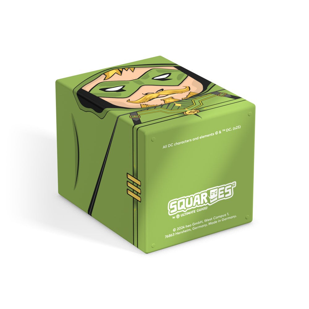 Collectible box for storing TCG decks, tabletop gaming accessories, and/or collectibles. The Green Arrow™ Squaroe from the DC Justice League™ edition holds up to 100 cards in double protective sleeves if used as a deck box. Squaroes are made from 78% renewable resources.