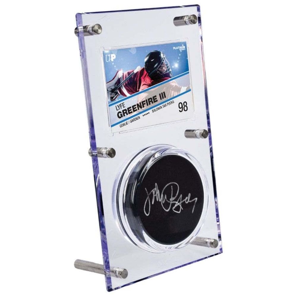 Safely stores and displays 1 puck & 1 standard size trading card up to 35pt thickness